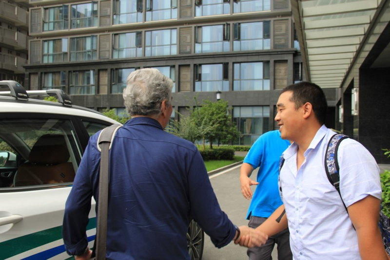 6月19号上午9:00,经过两天的精心准备,众向之家全体成员严阵以待,预备以最高级别的礼仪迎接贵宾的到来。负责本次接待工作的我司领导有总经理李必军教授,市场总监孙福生老师,以及研发部经理王鑫、郑玲等。9:30左右,在专车接待下,两位贵宾应邀而至,我司全体成员盛情接待。 巴齐先生到来,研发部经理王鑫接待现场。 巴齐先生拜访了我司,双方就智能车技术、APP 智能操控技术展开了深入会议交流。在会上,我司研发经理王鑫介绍了我司发展历程及主要产品,其中重点介绍了我司 APP 远程操控无人车及机器人技术,巴齐先生表达出了强烈兴趣,同时,巴齐先生也给我们展望了未来智能车的发展前景,给现场同仁深入启迪。 巴齐先生对 APP 远程操控技术兴趣浓厚,他热情介绍 SHARA’Ngo EV 车。